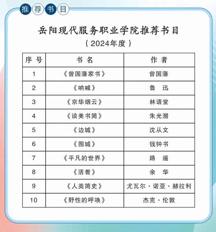 为了落实省教育厅(关于印发湖南省职业院校楚怕读书行动计划20242025)的通知》【湘教发[2024116号]文件精神,努力做好“书香校创建”工作,开云在线登录app入口图书馆、学生处共同推出2024年“好书共享”书单,以出全校广大师生学习参考。