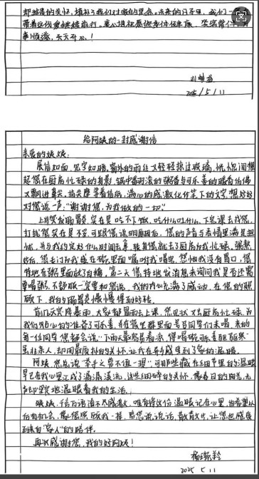 近日,学校收到两名学生亲笔书写的感谢信,向宿管阿姨皮家乐表达深深的感激之情,这份跨越身份的真挚情感,让整个校园都洋溢着温暖的气息。