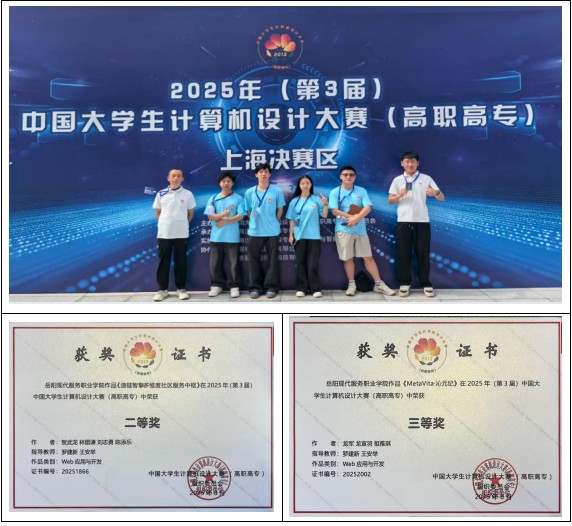 8月6日,在第18届中国大学生计算设计大赛中,由我校信息工程学院罗建新、王安举老师指导的,软件技术专业贺武龙、林熠谦、刘志勇、陈添乐同学的作品《速链智擎·多维度社区服务中枢》获得全国高职组“软件应用与开发大类”二等奖,软件技术专业龙军、龙宣羽、祖雅琪同学的作品《MetaVita·沁元纪》获得全国高职组“软件应用与开发大类”三等奖。(王安举)