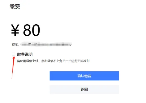 进入缴费页面-勾选缴费说明点击确认缴费,微信扫描屏幕二维码完成缴费。