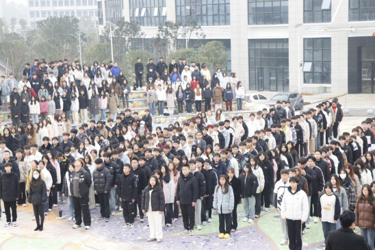国旗护卫队迈着整齐的步伐护送鲜艳的五星红旗至升旗台,伴随着雄壮的《义勇军进行曲》,五星红旗冉冉升起,全体师生行注目礼,场面庄严肃穆。
