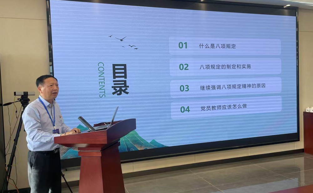课堂上,刘宇赤同志深入浅出地介绍中央“八项规定”具体内容、产生背景、现实意义和实践指导价值。针对党员教师这一特殊群体,提出了贴合实际的具体实践要求,强调“八项规定”堪称作风建设的 “金钥匙”,更是每一位党员干部弘扬教育家精神、做新时代大先生的 “必修课”。党员教师必须以身作则,切实将规定精神全方位融入日常的教学科研工作以及一言一行之中。
