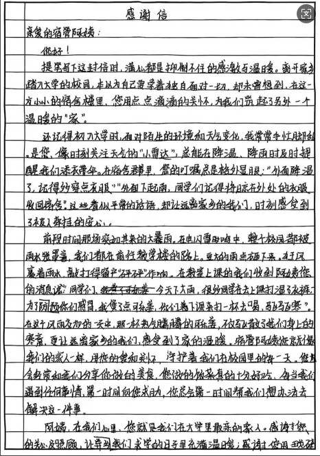 近日,学校收到两名学生亲笔书写的感谢信,向宿管阿姨皮家乐表达深深的感激之情,这份跨越身份的真挚情感,让整个校园都洋溢着温暖的气息。在学生们撰写的感谢信中,字里行间满满都是对皮家乐阿姨日常关怀的感动。初入校园时,面对陌生环境与多变...