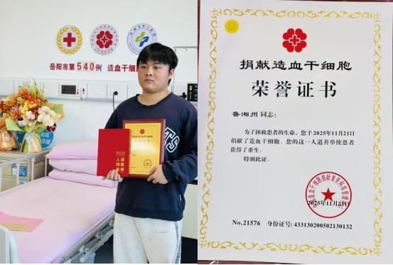 11月21日,岳阳市中心医院内上演了一场温暖的生命接力——我校电子信息工程技术专业32302班21岁学子鲁湘州同学,成功捐献造血干细胞混悬液,为远在北京的一名白血病患者送去重生希望。捐献期间,副校长张莉率学生处、党办负责人专程前往医院看望...